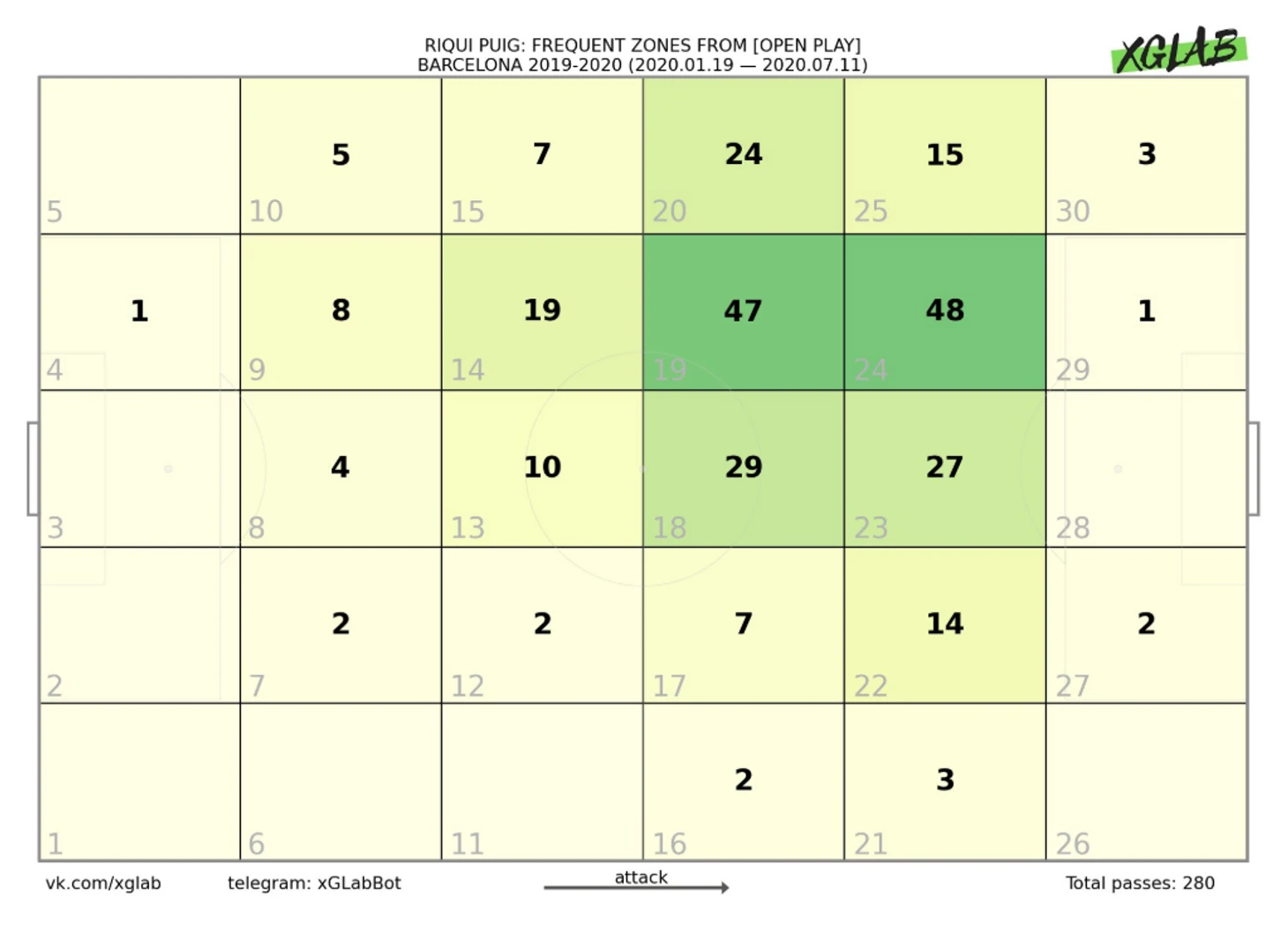 Из-за своих технических и антропометрических качеств Рики редко завершает атаки. Он мало вбегает в штрафную (0,10 xG/Sh) при кроссах или во время позиционного наступления. Его наиболее частые действия в финальной трети – создать пространство в центре для Месси или для опусканий центрального нападающего, выдергивать фланговых игроков соперника для врываний Альбы, а в фазе завершения – контролировать зоны «второго мяча» и реже занимать Assist Zone слева в штрафной. С последним он, кстати, справляется не очень хорошо. Есть моменты, когда он может сместиться в указанную зону для создания линии передачи, но находится в статике: