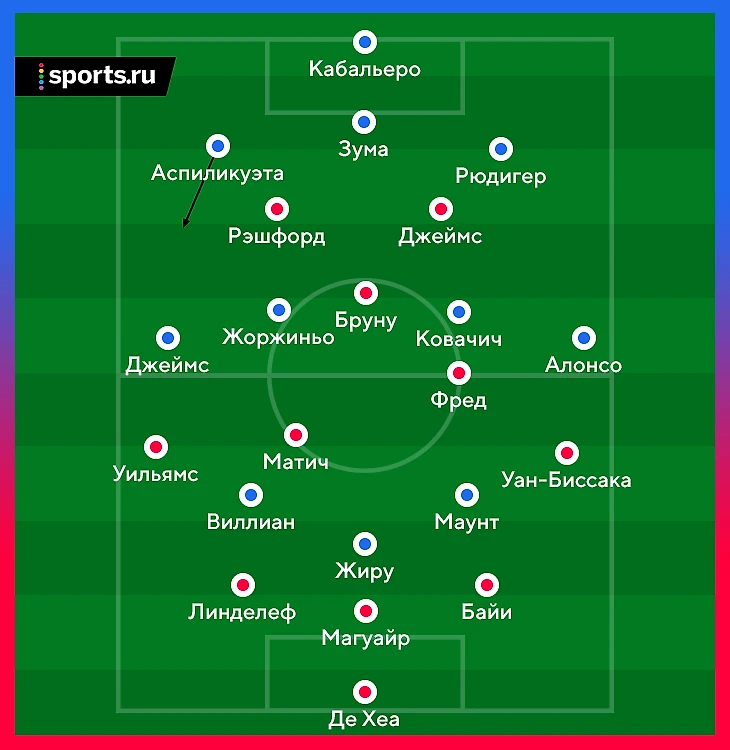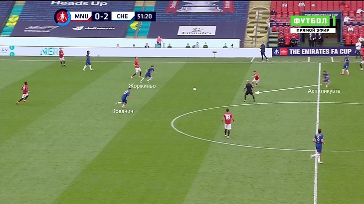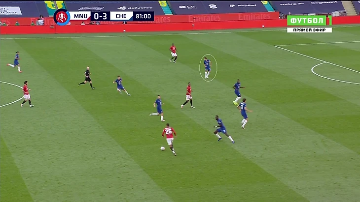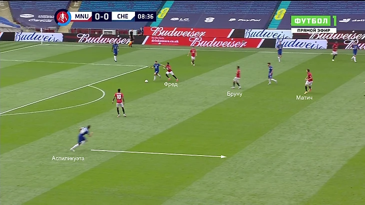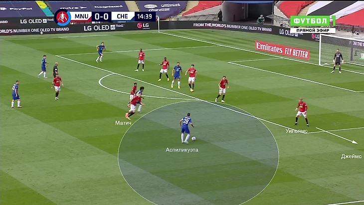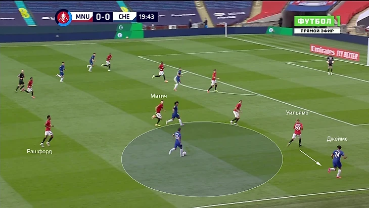 Команда Лэмпарда выманивала соперника в прессинг. При этом «МЮ» не мог прессинговать персонально, как изначально собирался. Обычно разрыв наблюдался в центре поля – Фред и Бруну действовали агрессивно, а Матич колебался и не шел до конца. Именно своевременные рывки Аспи создавали варианты для выхода: