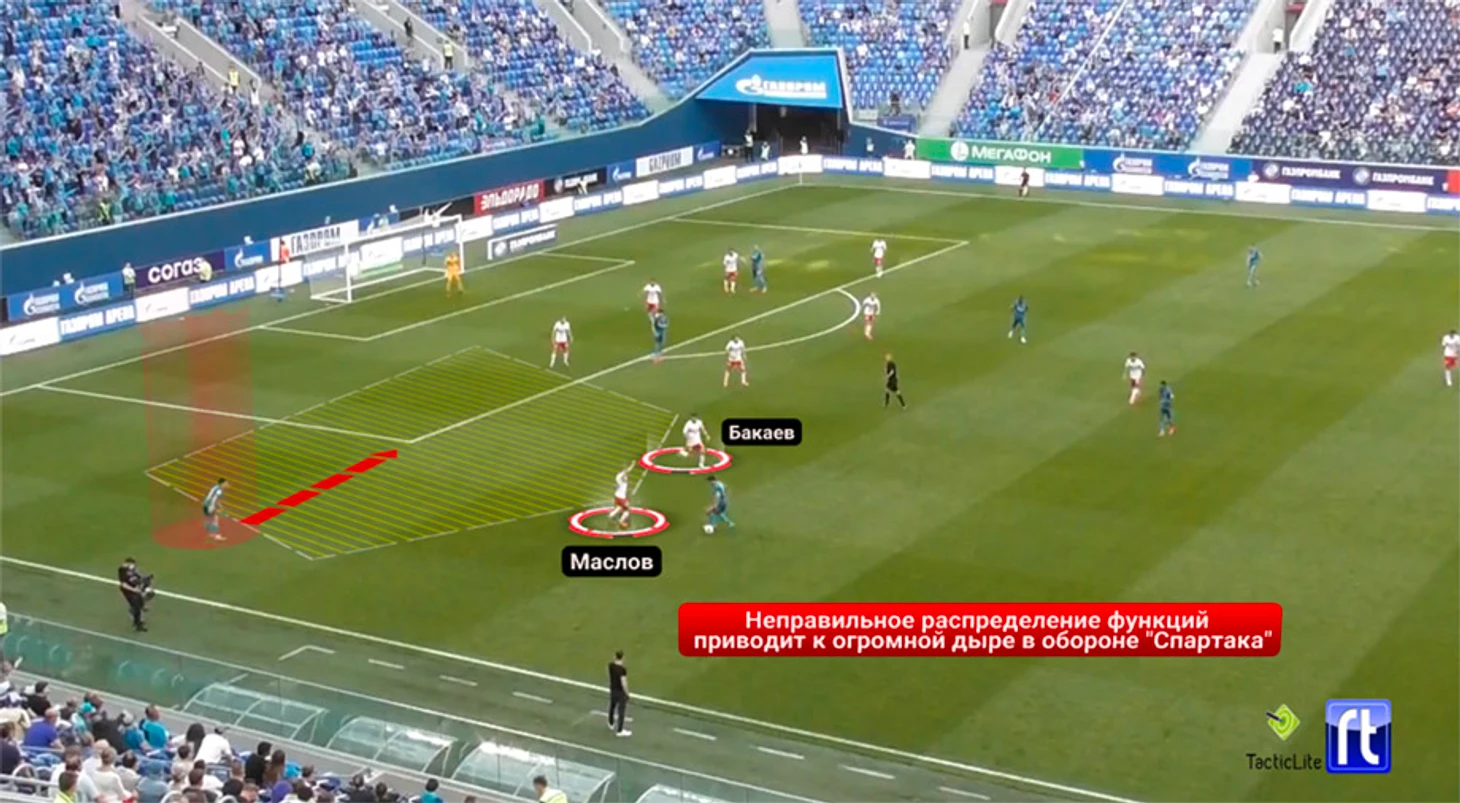 По ходу первого тайма, проходившего с большим преимуществом «Зенита» (одна из причин – как раз тот факт, что «Спартак» не мог выйти из обороны через розыгрыш мяча), Семак верно прочувствовал два момента. Первый: давление на фланг Маслова и Гапонова должно быть ещё сильнее. Второе: на противоположной бровке из-за высокого расположения Малкома слишком большую свободу получал Айртон. Кроме того, под манёвры спартаковского бразильца часто подстраивался Бакаев – и вдвоём они придумали две очень опасные контратаки.