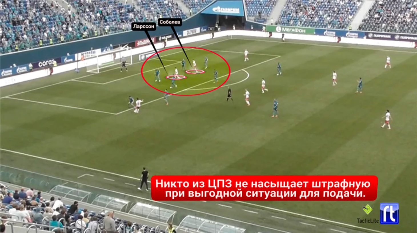 Хотя сам «Спартак» мог гораздо активнее насыщать зону при нахождении мяча на бровке. Было немало эпизодов, когда у красно-белых была возможность количественно увеличить давление при навесах, но впереди оставались всё те же Соболев и Ларссон.