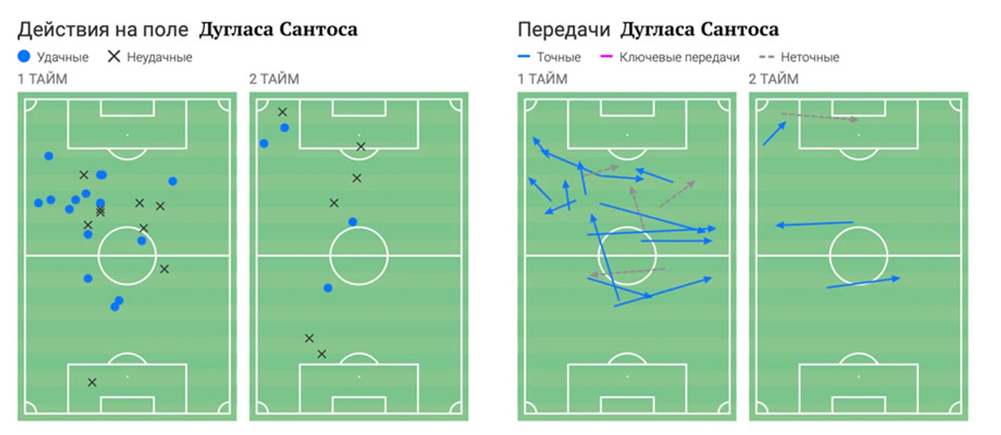 «Зенит» же стабильно отправлял на этот фланг не только Жиркова и Кузяева, но ещё сюда смещался центральный полузащитник Дуглас Сантос. Если взглянуть на карту действий бразильца в первом тайме, то отчётливо можно увидеть основной диапазон его встреч с мячом. Он помогал Жиркову и Кузяеву выбираться из-под давления и выходить на позиции, выгодные для нацеленной передачи в штрафную. Иногда в зону Гапонова-Маслова смещался и один из форвардов.