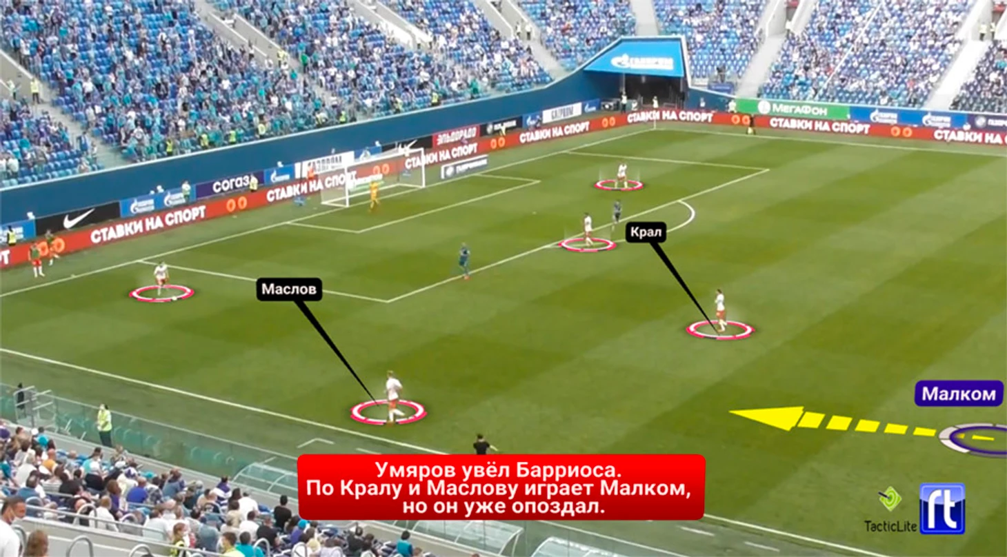 Но Малком, как мы помним, участвует в структуре прессинга во второй линии. По идее, Жирков должен был расположиться вместо него между Кралом и Масловым. Однако Юрий всё же решил вернуться назад и поменяться обратно позициями с Малкомом.