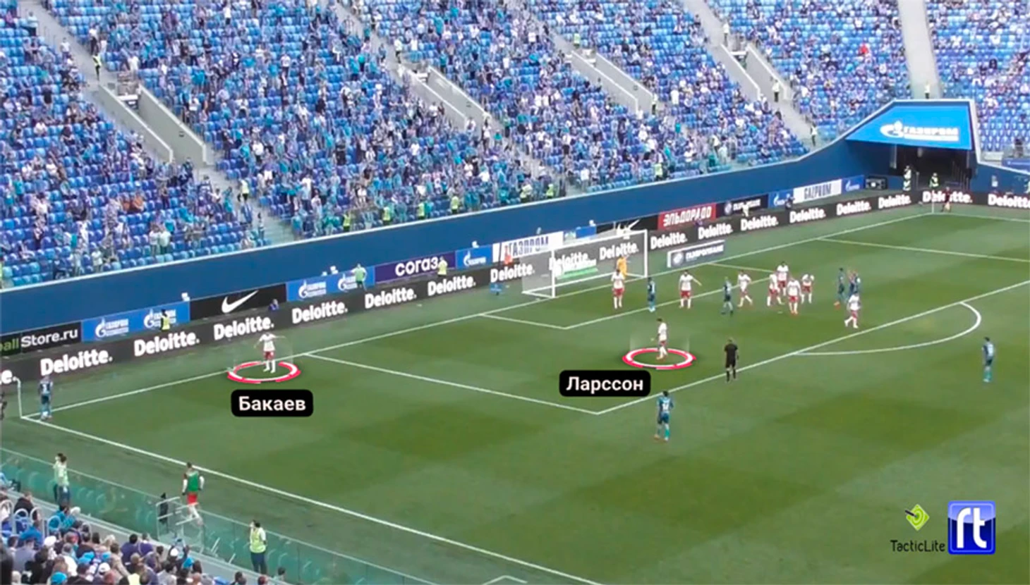Жирков застрял в полупозиции, поэтому страховать фланг пришлось Ракицкому. Украинец не решился выброситься (боялся, что его обыграют, пласировался) – и позволил Бакаеву выполнить адресный навес. А Ларссон и Соболев оказались из-за всех этих перестроений в чужой штрафной вдвоём против двоих. Причём Соболев играл против крайнего защитника Караваева.