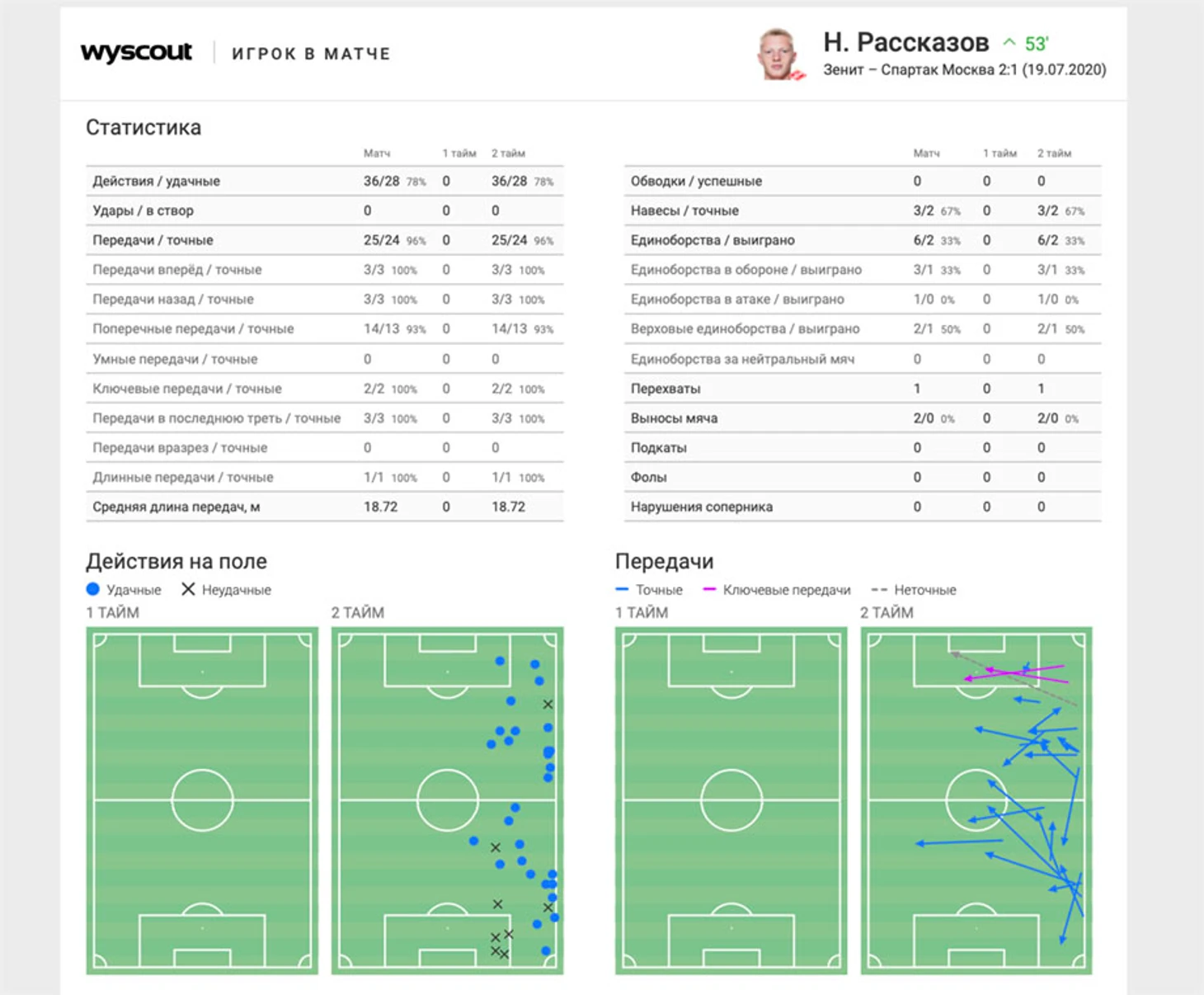 Рассказов же не просто помог команде более уверенно разбивать чужой прессинг, но ещё и совершил несколько опасных включений. В том числе именно он выполнил самый опасный навес второго тайма на голову Соболева.