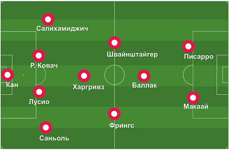 Лидером обороны «Баварии» стал Лусио, в воротах играл главный ветеран и капитан «Баварии» того времени – Оливер Кан. К слову, Кан занимает второе место по количеству игр за мюнхенцев, уступая лишь легендарному вратарю Зеппу Майеру, который начал выступать за «Баварию» на заре Бундеслиги.