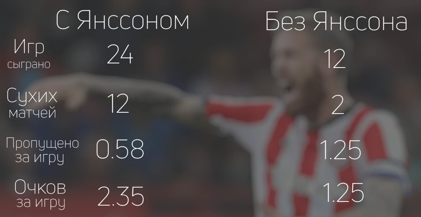 Даже в последнем матче, когда «пчелы» проиграли «Стоку» и впервые не выиграли с февраля, Янссон совершил огромный объем работы и многие ресурсы называли его игроком матча. Центрбэк выиграл 10 из 11 дуэлей, 8 из 9 в воздухе и 2 наземных. 8 из 10 длинных передач шведа дошли, а также он отдал 1 ключевой пас. Говорить нечего, статистика просто отличная.