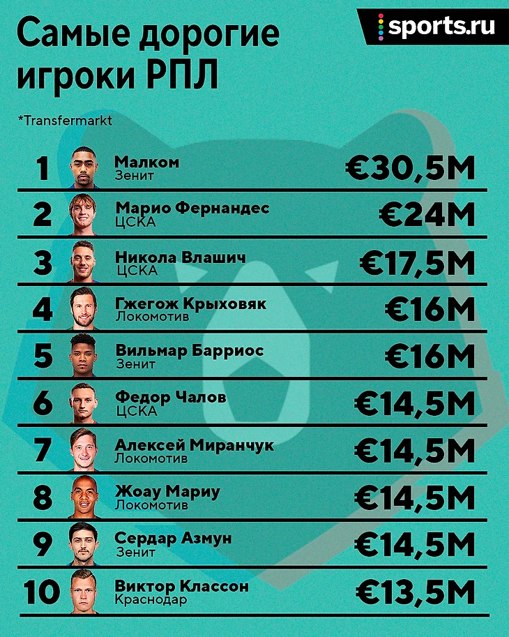 Рейтинг самых дорогих игроков РПЛ от Transfermarkt выглядит так: