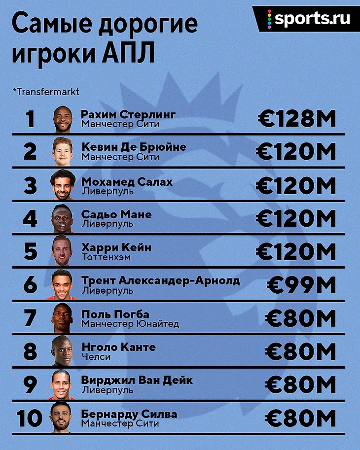 В топе АПЛ 3 игрока из «Ливерпуля», и 4 – из «Сити». Ван Дейк за полгода подешевел на 20 миллионов