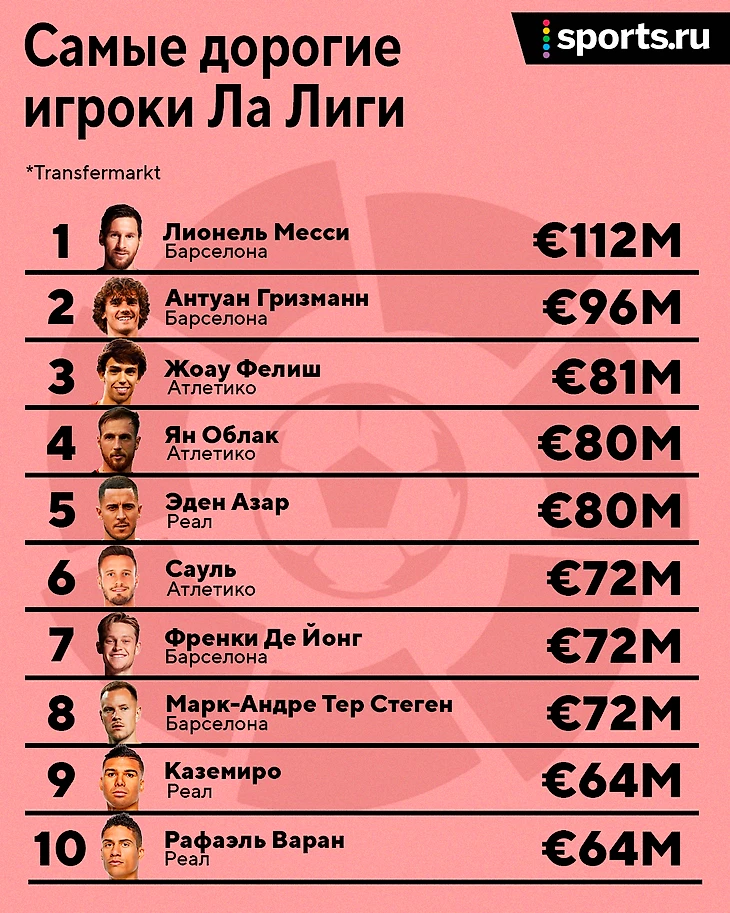 – Ла Лига стала единственным чемпионатом, где в топ-10 попали голкиперы. Во многом это связано с общим уровнем цен: Алиссон тоже стоит 72 млн, но в АПЛ этого недостаточно для десятки самых дорогих.
