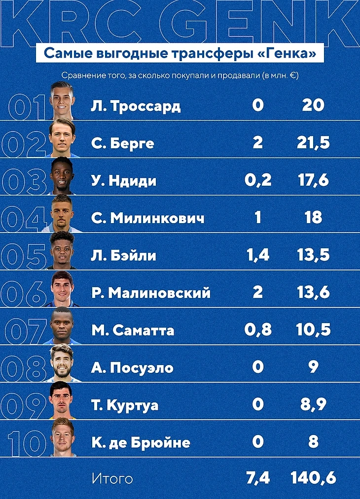 И вообще таких историй много: «Спортинг», «Сан-Паулу», «Сантос», «Саутгемптон», «Шальке», «Фейеноорд». Для рассказа мы выбрали бельгийский «Генк». Просто потому, что бывших игроков этого клуба и выпускников его академии можно найти во многих топовых клубах и почти каждой топовой лиге.
