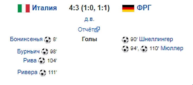 На 94-й минуте немцы подают угловой, затем следует ряд крайне неудачных действий защитника итальянцев Полети и мяч от его ноги влетает в ворота сборной Италии.ЧМ -1970. Италия - ФРГ 4:3. На 99-й минуте после розыгрыша штрафного итальянец Бурньич, воспользовавшись ошибкой в центре обороны сборной ФРГ, сравнивает счёт.За минуту до конца первого экстра-тайма Рива после паса Доменгини выводит сборную Италии вперёд. На 110-й минуте Мюллер, после розыгрыша углового, головой проталкивает мяч в ворота мимо стоявшего у штанги Риверы и снова делает счёт ничейным.