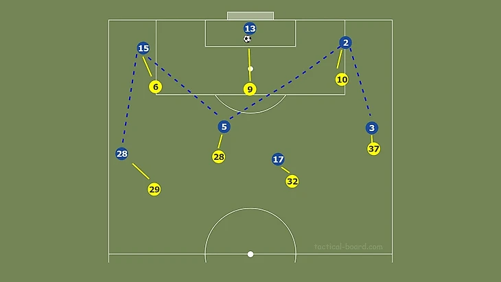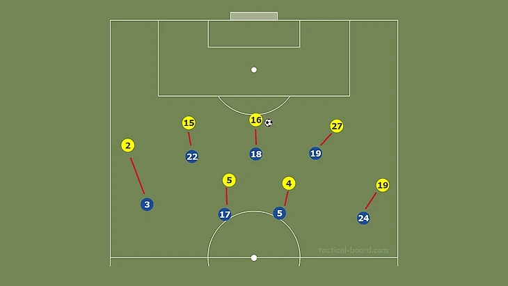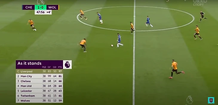 "Волки" в заключительные 15 минут проявляют активность, на свежих ногах в лице Моутиньо, Траоре, Поденсе, Винагре и Жордао, организовывая высокий прессинг. "Челси" успешно его проходит за счет выстраивания игроков буквой «м». Центральные защитники располагаются достаточно широко по краям штрафной площади, растягивая прессинг двух нападающих волков. По центру опускается Жоржиньо, либо вышедший позже на замену Лофтус-Чик. Аспиликуэта на позиции крайнего защитника поднимается выше и остается открытым для передачи от вратаря. Алонсо также уходил чуть повыше, но был под контролем Траоре. Безопаснее было выходить из под прессинга через правый фланг.