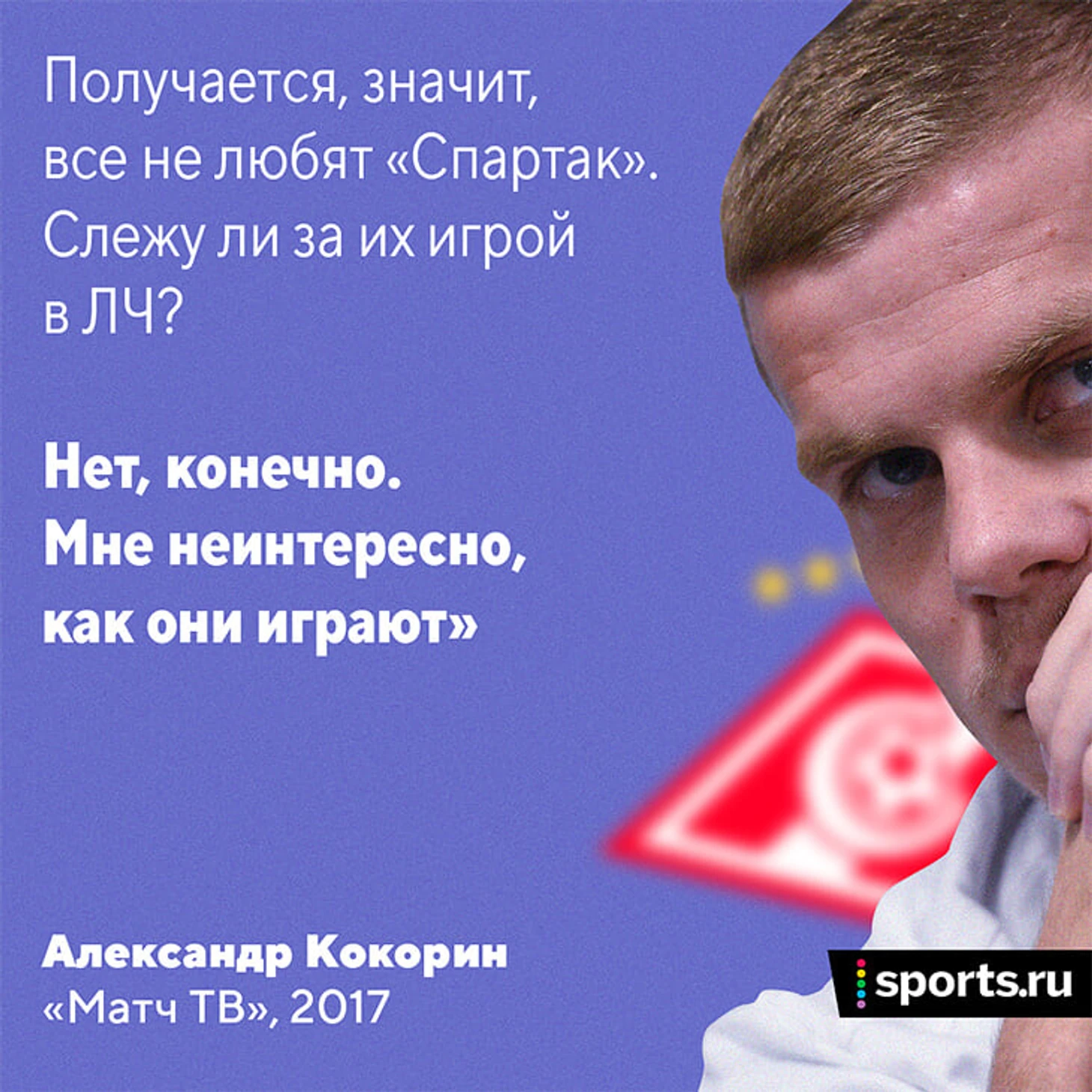 Когда «Спартак» стал чемпионом в 2017-м, Кокорина (тогда игрока «Зенита») вновь спрашивали о красно-белых и их участии в Лиге чемпионов. Он рассказывал, что это его самый принципиальный соперник в карьере: «И в «Динамо» это был самый важный соперник, и в «Зените» главный раздражитель. Если так получается, значит, все не любят «Спартак». Слежу ли за их игрой в ЛЧ? Нет, конечно. Мне неинтересно, как они играют».