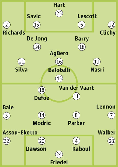 Запасные: Гомес, Кудичини, Чорлука, Таунсенд, Бассонг, Павлюченко, Джованни, Роуз, Ливермор, Кранчар, Фальке, Пиенаар