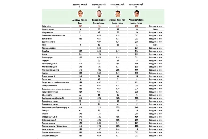 С другой – сезон предвидится очень сложным и насыщенным, времени на восстановление будет не хватать. Мы помним, что в ключевой игре в Санкт-Петербурге «Спартак» остался с двумя форвардами – Соболевым и Ларссоном, и даже усилить игру по ходу полуфинала было некем. Есть подозрение, что для предстоящего чемпионата четыре нападающих – это абсолютно нормально. Тем более, повторю, состав «Спартака» станет сильнее: Кокорин по атакующим метрикам в комплексе лучше любого нападающего красно-белых. Из таблицы снизу я специально убрал матч с «Ростовом» (10:1), но даже без него большинство показателей Александра интереснее.