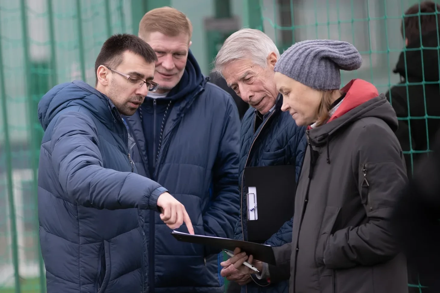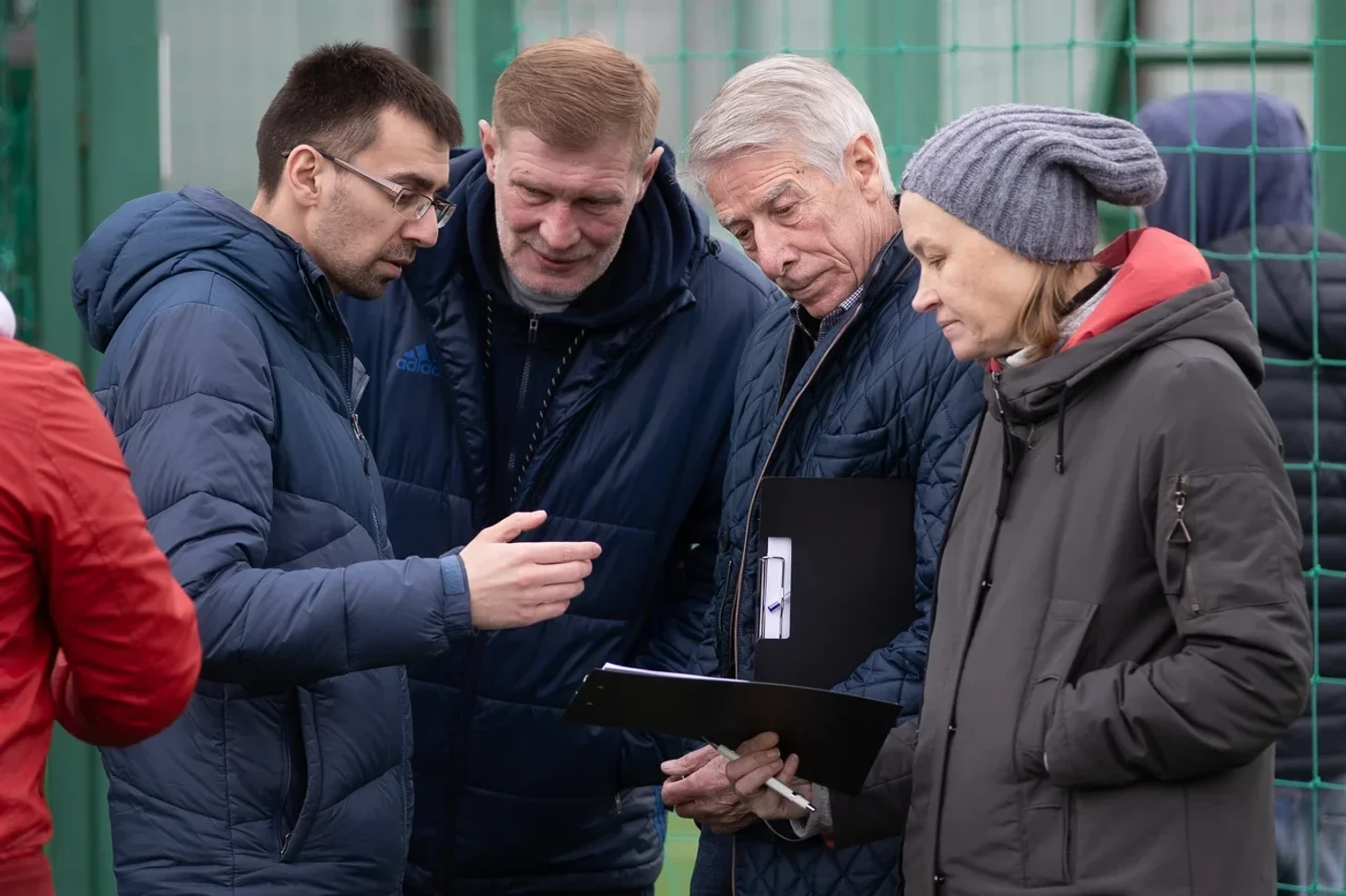 Основатель проекта Алексей Маслов и тренеры Валерий Непомнящий, Александр Подшивалов и Валентина Баркова оценивают футболистов на тестовом запуске проекта.