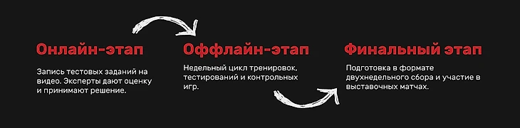 Участники проходят три этапа отбора. Чтобы перейти к следующему, футболисту необходимо успешно пройти тесты и контрольные игры.
