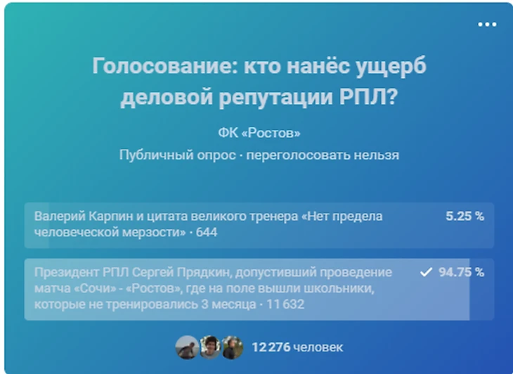 «Сейчас разговор пошёл в другую сторону: а ведь «Ростов» поддержал Прядкина в момент, когда РФС пытался его сместить. Получается такой недальновидный шаг, и теперь всё на него валят. Нет, друзья мои, дело совершенно не в этом. Когда клубы поддержали Прядкина, они поддержали не его лично и уж тем более не его программу действий, которой в принципе не существует. Клубы воспротивились тому, что им хотят навязать нового главу лиги вопреки всему. Вопреки просто их желанию, не спросив. Вот это было причиной единогласного голосования за Прядкина.