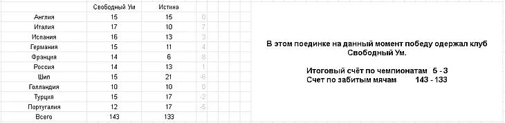 Затем, то же самое делается по всем другим чемпионатам и в итоге получается сводная таблица, показывающая, кто же сильнее.