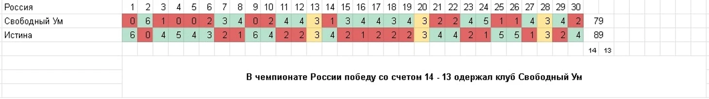 Что же делает этот файл? Он позволяет сравнить выступление 2 франшиз по ходу всего сезона, виртуально сравнивая их результаты в каждом туре каждого чемпионата. Звучит непонятно? Сейчас разжую на примере. Допустим, мы хотим узнать, кто же сильнее, Свободный Ум или Истина. Так в первом туре чемпионата России Истина победила в своем матче со счетом 2-4, а СвУм проиграл 1-5. Но нас это не сильно волнует. Мы сравниваем выступления этих двух франшиз, будто бы они играли между собой и получаем, что в случае их встречи Истина бы победила со счетом 6-0.