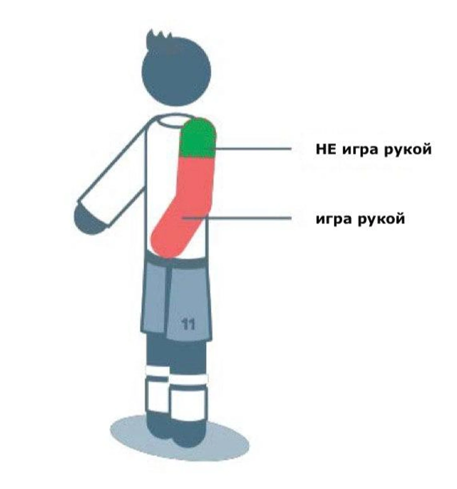 - Игра рукой всегда была сложнейшим подпунктом правил. Теперь игра рукой определяется по границе «нижней части подмышки» (см. рисунок). Особое внимание уделено случайному касанию мяча рукой в штрафной площади: если после случайного контакта (речь об игроке атакующей команды) забивается гол или создается возможность немедленно забить гол, то это является нарушением правил. Если же мяч прошел несколько метров после случайного касания и затем забит гол, то правила не нарушены.