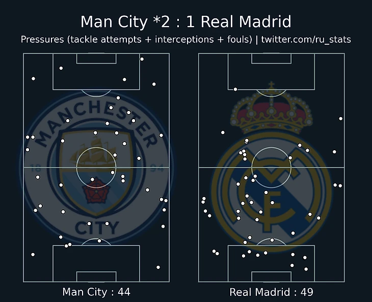 Как видно из карты, Сити прессинговал значительно выше, в равной степени как на своей, так и на чужой половине.