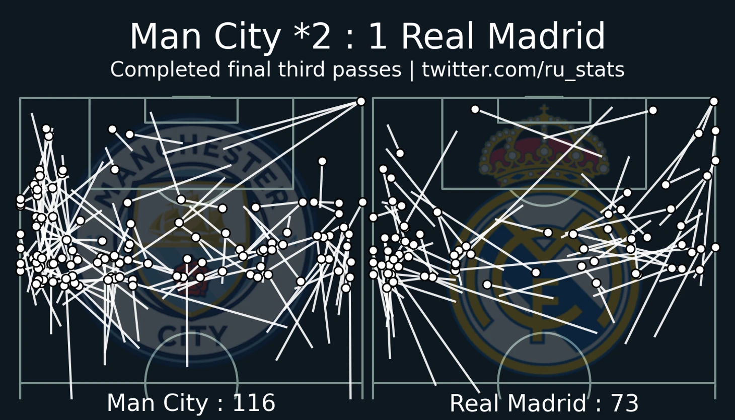 Сити был активнее чем Реал, чаще использовал левый фланг. Наибольшее количество пасов в финальной трети совершили Жоао Канселу (22), Кевин Де Брейне (19), Габи Жезус и Илкай Гюндоган (оба 17). Лучший результат у Реала - Ферланд Менди (15). Однако, на карте видно, что чаще это были передачи назад.