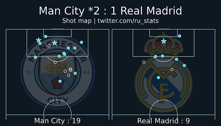 Карты ударов Сити и Реала. Не закрашенные кружки - удары мимо, закрашенные - сэйвы вратаря.
