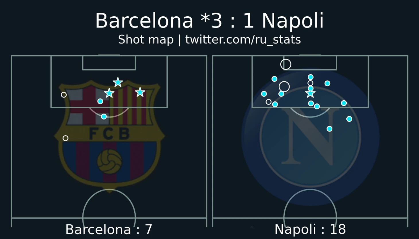 Карта ударов матча. Наполи был активнее, дважды попал в каркас ворот (большие незакрашенные кружки). Барселона забила 3 из 5 ударов в створ.