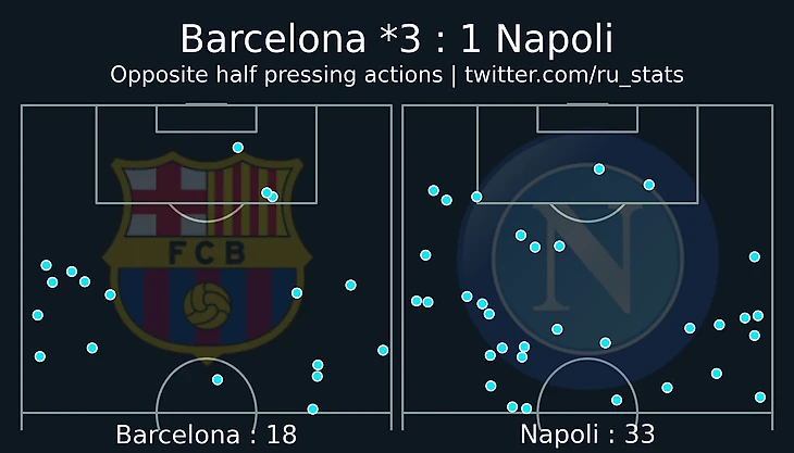 Показатель PPDA (количество передач соперника на одно прессинг действие) Наполи - 10, Барселоны - 13.5 (чем меньше цифра - тем активнее прессинг).