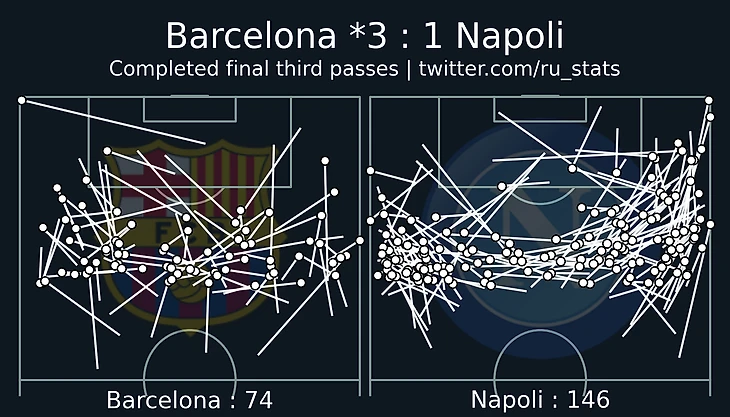 Карта передач в атакующей трети поля. Наполи больше владел мячом вблизи штрафной Барселоны.