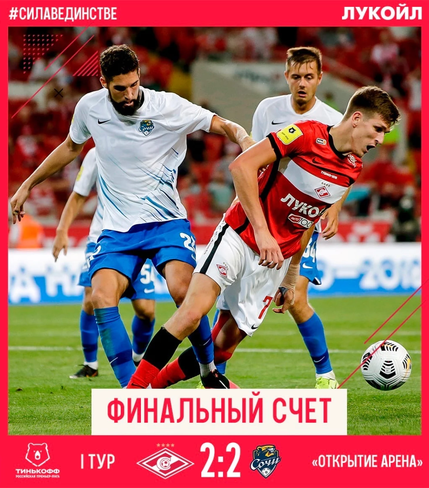Футболисты «Спартака» и «Сочи» не выявили победителя в стартовом туре чемпионата России. Встреча, прошедшая в воскресенье в Москве, закончилась со счетом 2:2.