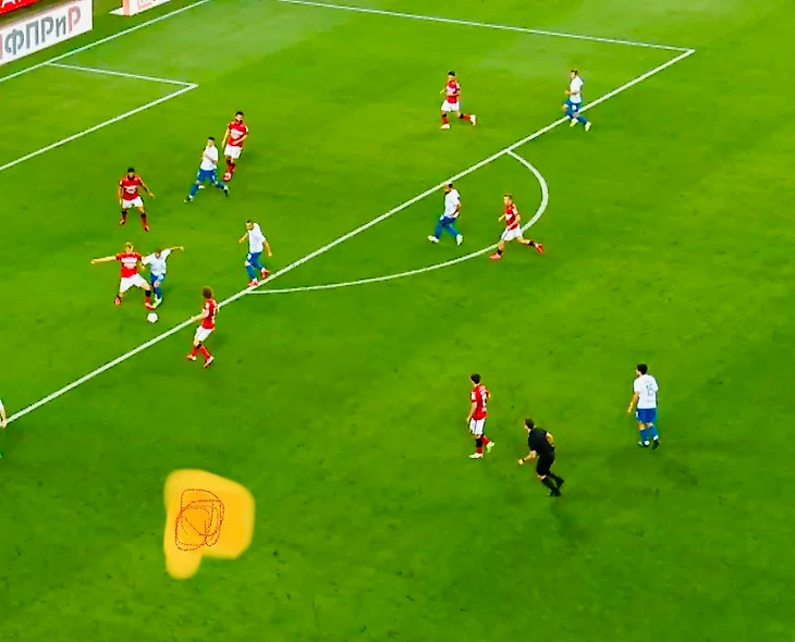 По первому пенальти: по-моему, нападающий «Сочи» врезается в игрока «Спартака». Контакт был, но не потому, что фолит защитник. Защитник идёт на мяч. Даже если нападающий носков проталкивает мяч, он не может сделать это, не коснувшись шипов защитника «Спартака». Это фол в нападении. К тому же Казарцев плохо видел момент: выглядывает из-за двух спин защитников. Смотрите фото. Должен быть там, где точка.