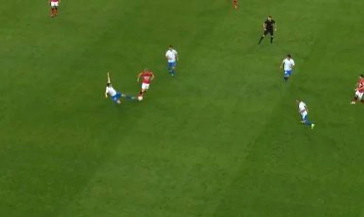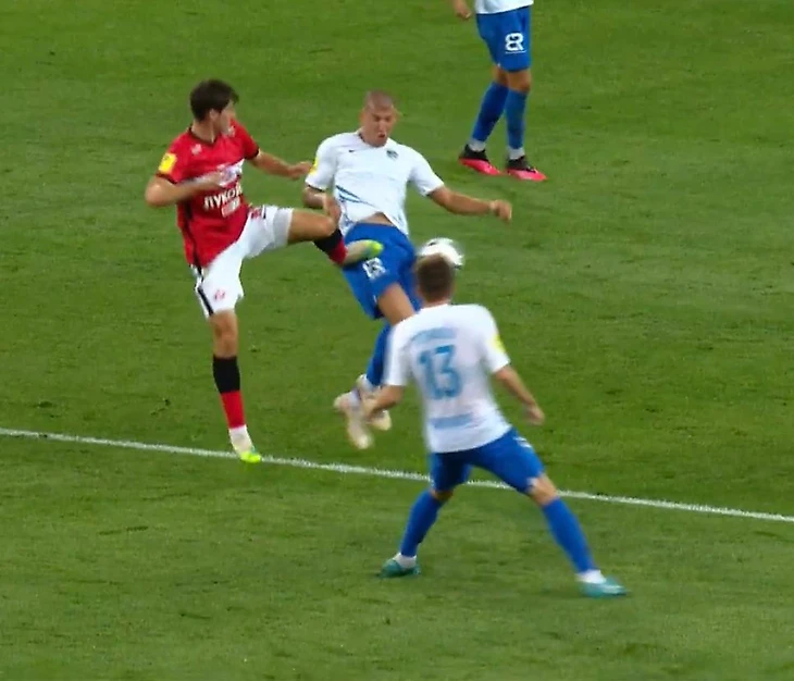 На 28 минуте Бакаев грубо играет против соперника: попадает шипами в ногу. Должна быть желтая карточка.