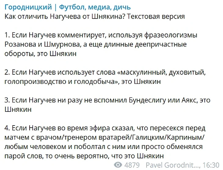 Автор «Евроспорта» и ютуб-блогер Павел Городницкий дал подробную инструкцию, как отличить Нагучева от Шнякина только по манере комментирования. Роман, кстати, репостнул.