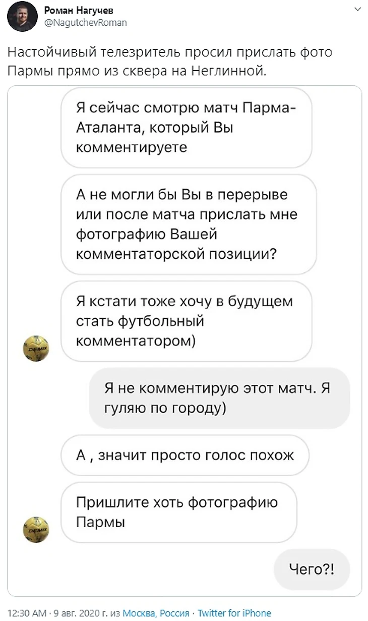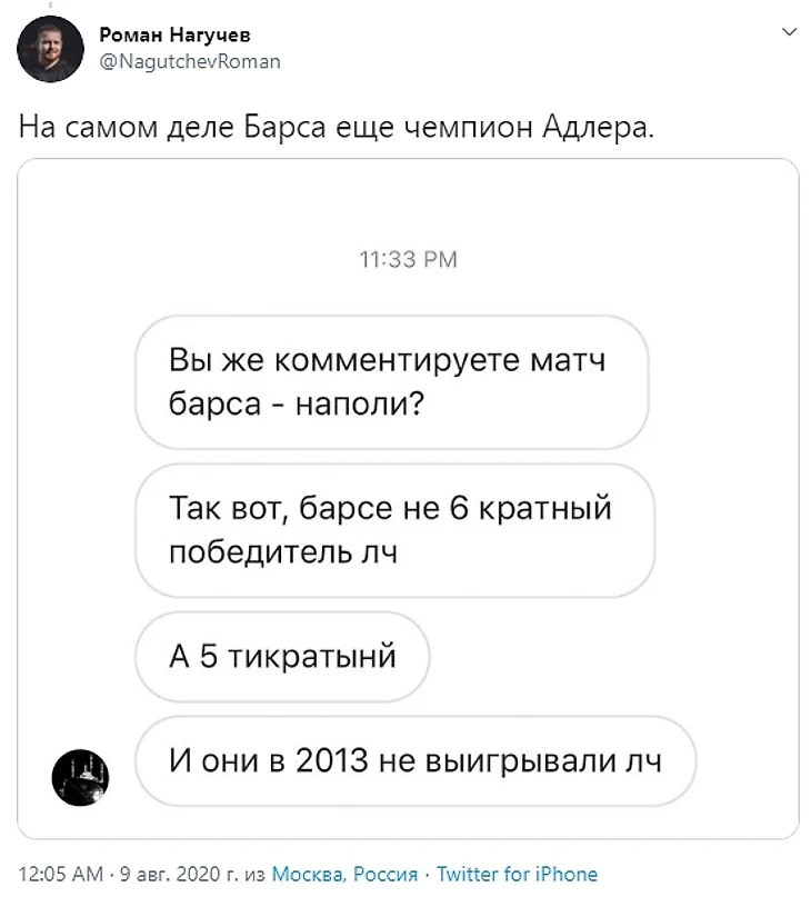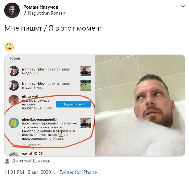 Во время матча «Наполи» и «Барселоны» в соцсети комментатора «Матч ТВ» Романа Нагучева посыпались оскорбления: его обвиняли в том, что он плохо и некачественно рассказывает про игру в прямом эфире (а вы смотрели? как вам?) Вот только сам Нагучев в это время принимал ванну – его просто перепутали с Дмитрием Шнякиным.