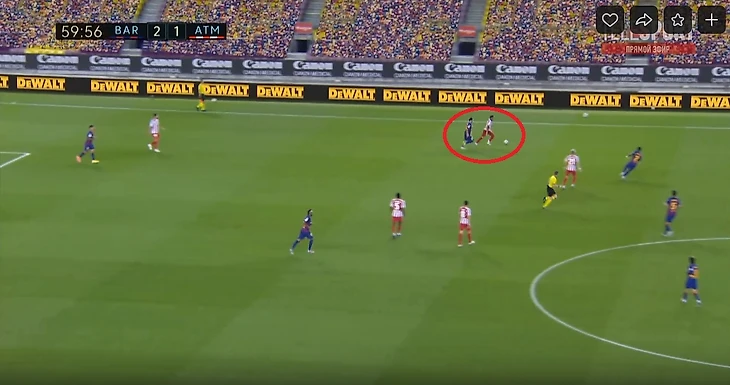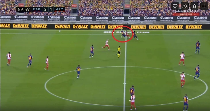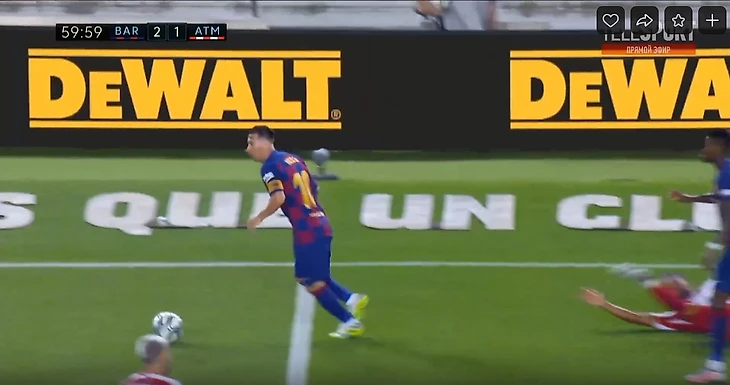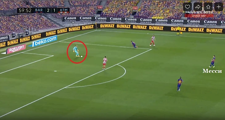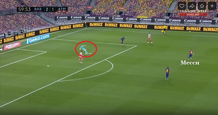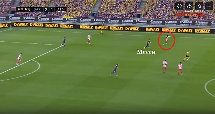 После неудачной атаки «Барселоны» мяч достался Яну Облаку, но Лео тут же постарался отвоевать его у соперника. После того как голкипер «матрасников» сделал передачу на своего партнера по команде, Месси словно стервятник, карауливший свою добычу, совершил рывок от штрафной гостей до центральной зоны и обезмячил игрока мадридцев.
