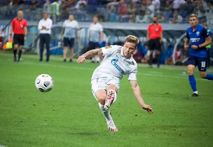 7. В позиционных атаках Зенит часто стартовал через Караваева. В полуфланг смещались Оздоев и Азмун/Дриусси, во фланге оставался Малком. Это давало возможности для интересных розыгрышей "на третьего", когда Оздоев или Караваев оставались свободными и могли зряче навесить.
