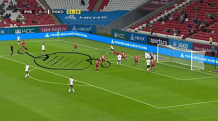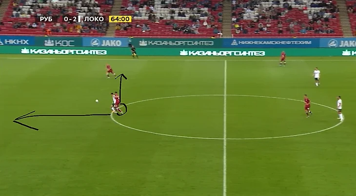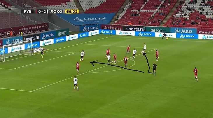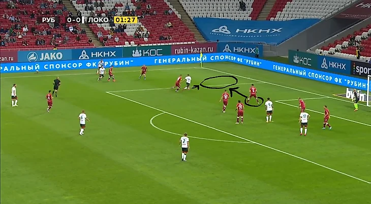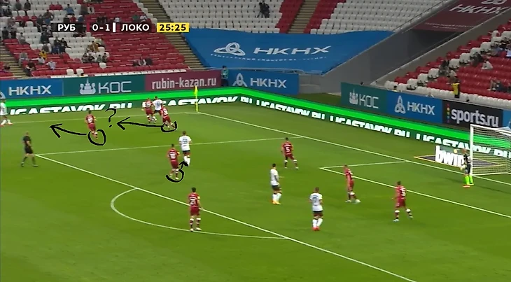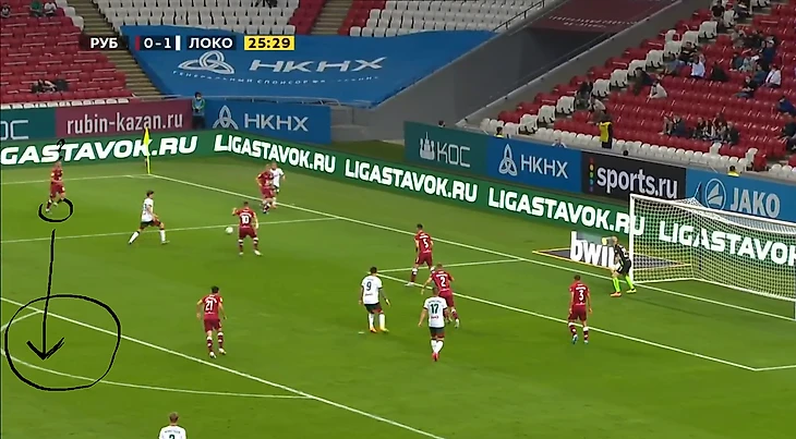 Обратите внимание на то, где находится Оливер. Датчанин абсолютно не логично сдвигается на подстраховку Бакаева. Ведь уже через пару мгновений Рыбчинский уберет Самошникова и окажется на совершенно раскрытом фланге. А еще через пару секунд, Дмитрий отдаст выверенную передачу под удар своего тёски. После чего последует незамедлительный и точный выстрел Баринова, который отправил "Рубин" в нокаут из которого казанский клуб уже не смог выбраться.