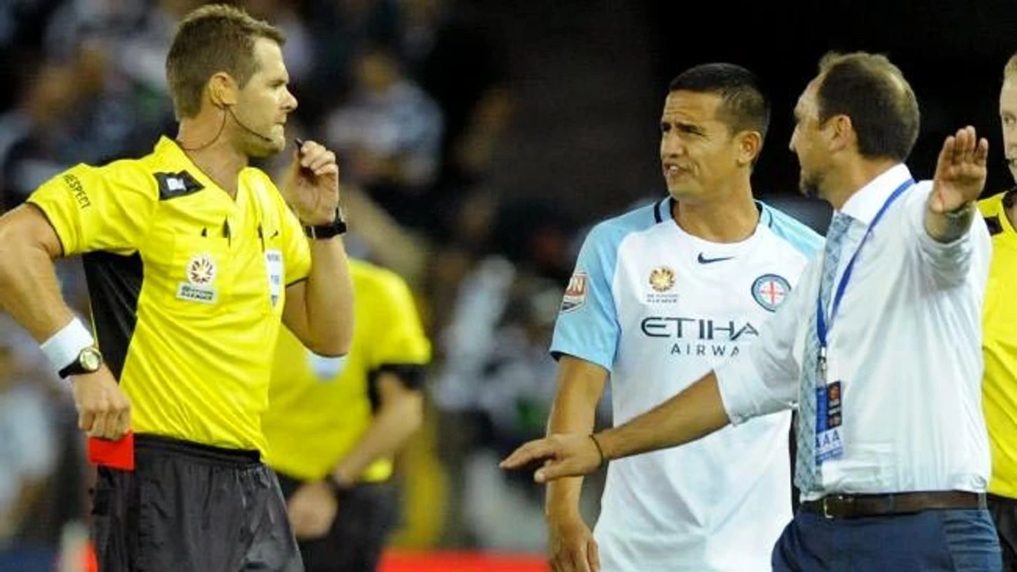 Лучший бомбардир в истории Австралии и экс-звезда “Эвертона” доигрывал на родине. И вот дерби - “Мельбурн Виктори” против “Мельбурн Сити”. 37-летний ветеран “Сити” готовился вступить в игру на 85-й минуте, при счёте 1:1. Но именно в тот момент команда Кэхилла пропустила. Боковой зафиксировал офсайд, но главный судья, после совещания, все же засчитал гол, ведь мяч срезал в свои ворота защитник. А Тим в это время кричал на судью, что тому явно не понравилось и он показал ветерану красную, не дожидаясь, пока тот выйдет на поле!