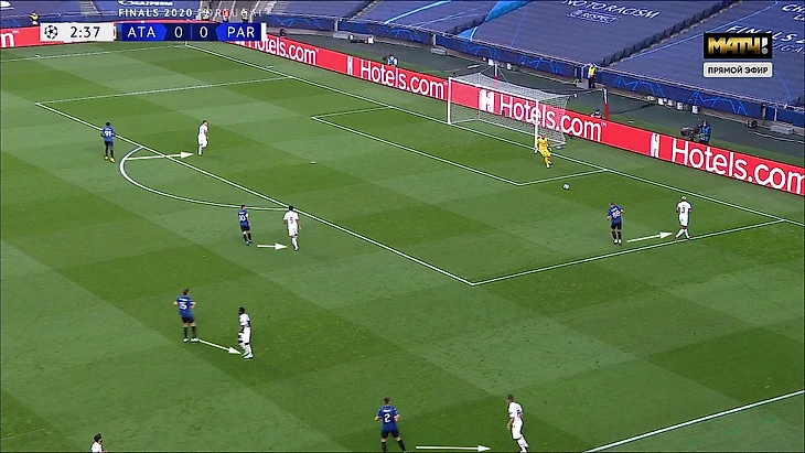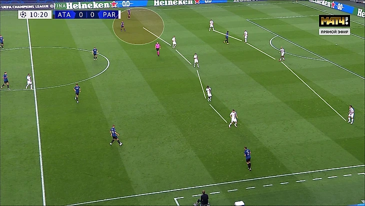 Но в этот раз риски играют против «Аталанты» – после дальнего паса тройка атаки оказывается против трех соперников на огромном пространстве (и мяч достается именно «ПСЖ»):