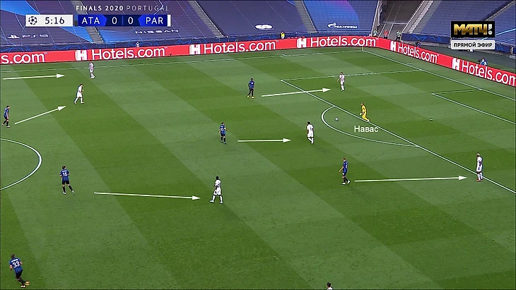 «Аталанта» персонально и высоко перекрывает все варианты для Кейлора Наваса (классика – команда отлично обучена такому прессингу):