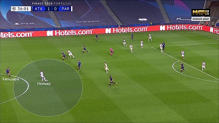 Вот, например, момент, в котором активного давления уже нет, а Неймар вытаскивает центрального защитника Толоя (оппонента по эпизоду) на свою половину. С этого по цепочке разрушится вся конструкция – и «ПСЖ» создаст момент: