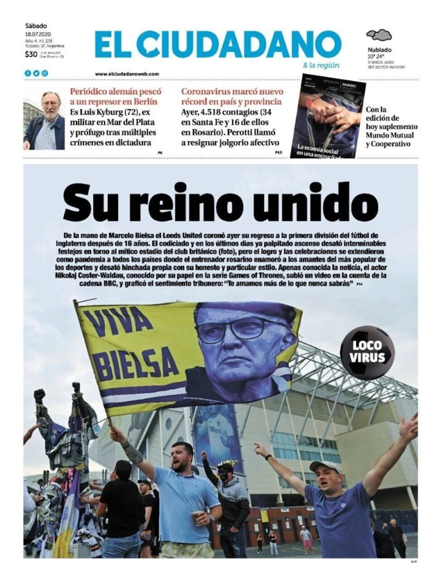 Футбол в Аргентине был приостановлен из-за пандемии, а коронавирус доминировал в газетных заголовках долгое время. Выход «Лидса» в Премьер-лигу стал поистине захватывающей историей для жителей Росарио. 18 июля на первой полосе El Ciudadano красовалась фотография болельщика с развевающимся флагом «Viva Bielsa» на фоне статуи Билли Бремнера и стадиона «Элланд Роуд». Заголовок гласил: «Su Reino Unido» — «Его Соединённое Королевство» (игра слов: United Kingdom – Leeds United, прим. пер).