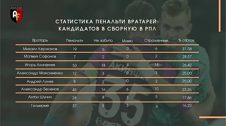 Хотя, может, я зря драматизирую? Ведь если сравнить показатели голкипера «Спартака» с коллегами по амплуа из числа кандидатов в сборную, то окажется, что по проценту отраженных одиннадцатиметровых ударов в чемпионате России у Максименко на общем фоне не так уж все и плохо - в 25% случаев вратарь не дал отличиться сопернику с точки. У главного специалиста по пенальти в нашем футболе - Игоря Акинфеева - этот показатель немногим выше - 26,42%. Только Михаил Кержаков показывает какие-то запредельные результаты, отражая почти треть, назначенных в его ворота, пенальти.