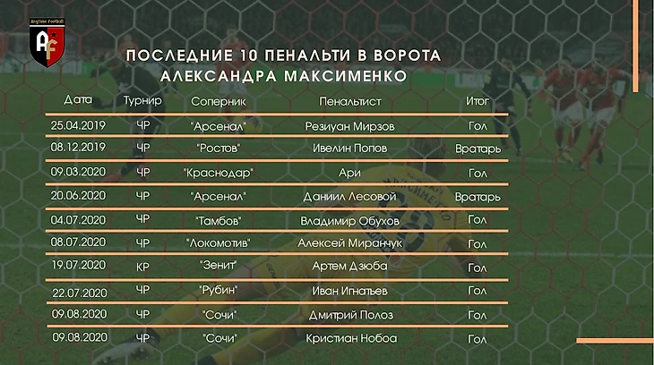 Эта неудачная статистика для голкипера «Спартака» стечение обстоятельств или все-таки закономерность? Если взять последние 10 пенальти, назначенные в ворота Максименко, то можно отметить определенную тенденцию: 22-летний вратарь стал действовать однообразно, особо не гадая, прыгает в правый от себя угол. Зная это, соперники без труда переигрывают Александра.