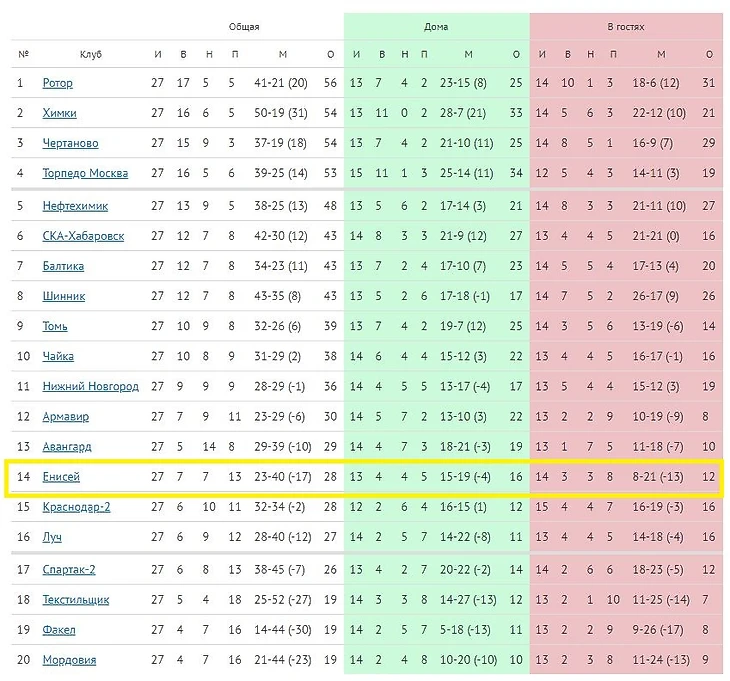 В сезоне 19/20 «Енисей» занял 14-е место, набрав 28 очков. Забитые и пропущенные 23-40. Домашние матчи команда играла лучше, чем выездные, но даже здесь разница в голах отрицательная 15-19(-4).