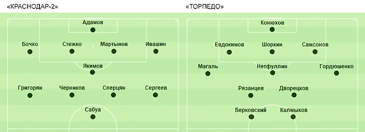 «Торпедо» (футболки – белые): №47 Конюхов, №16 Шоркин, №99 Евдокимов (№6 Шустиков, 90+2), №44 Самсонов, №7 Рязанцев – к, №8 Берковский (№11 Кертанов, 69), №17 Дворецков (№9 Адаев, 55), № 28 Магаль (№4 Елисеев, 46), №52 Нетфуллин, №72 Гордюшенко, №90 Калмыков (№10 Лебеденко, 60). Запасные: №51 Ботнарь, №49 Прошкин, №77 Сундуков, №15 Орехов. Тренер – С.Н.Игнашевич.