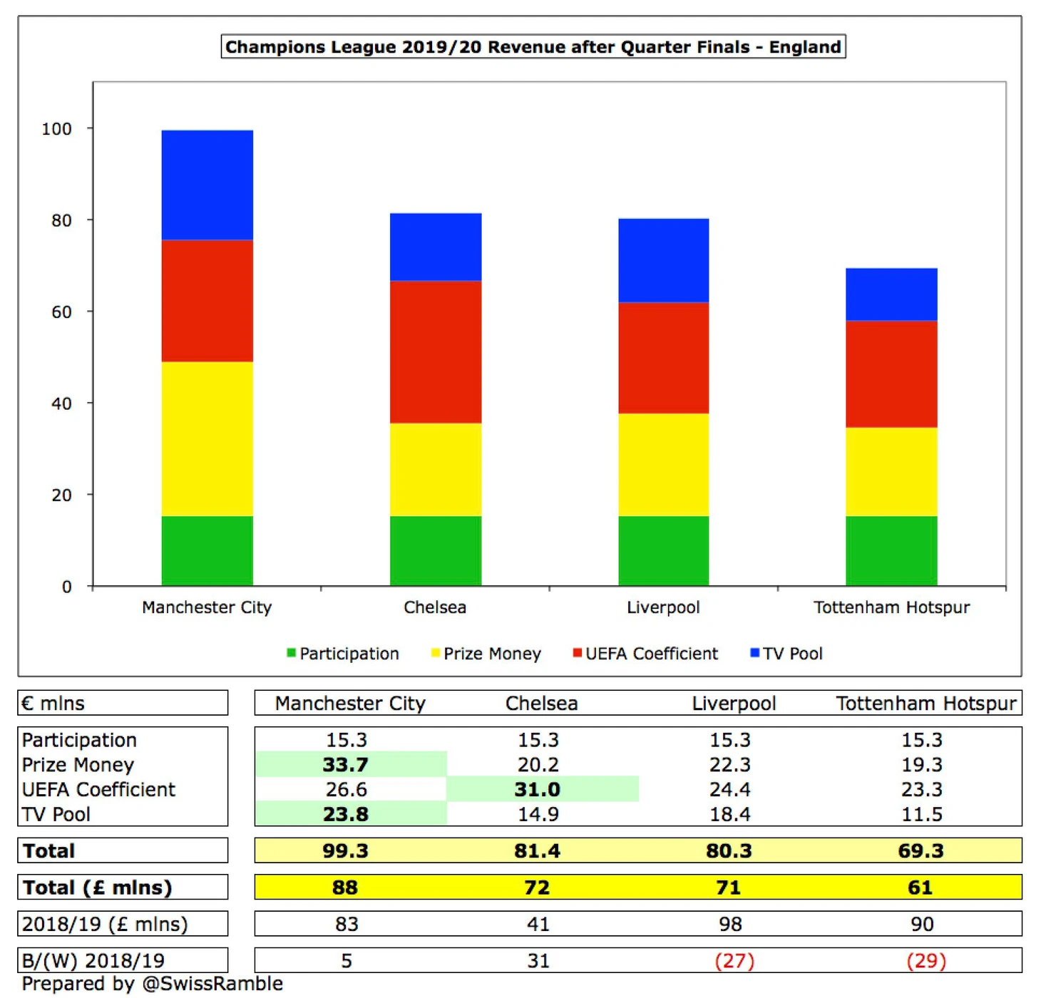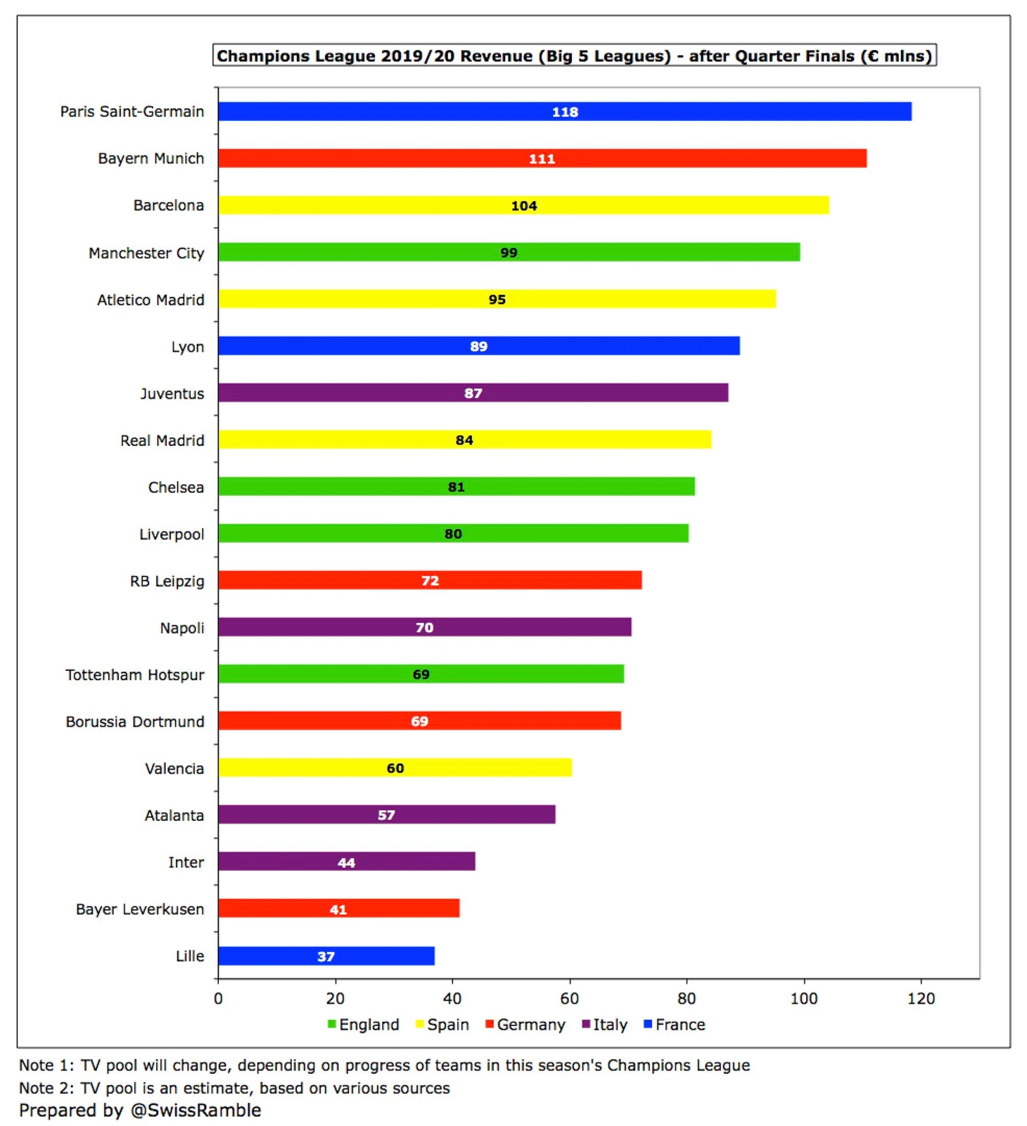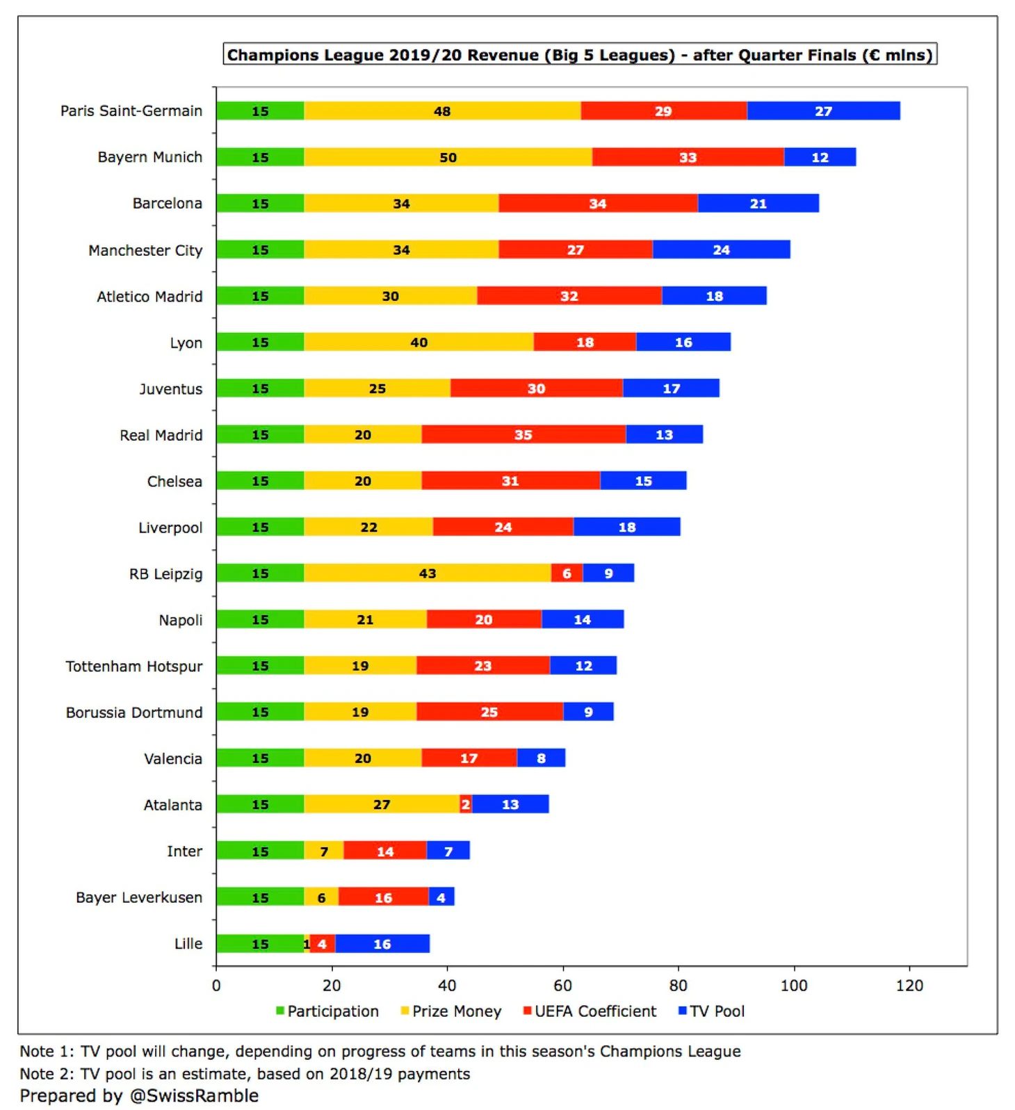 Только три клуба после ¼ сумели заработать более 100 миллионов евро: «ПСЖ» поднял уже 118 миллионов, «Бавария» – 111 млн., «Барселона» – 104 млн. За ними следуют «Манчестер Сити» (99 миллионов), «Атлетико» (95 млн.), «Лион» (89 млн.), «Ювентус» (87 млн.), «Реал» (84 млн.), «Челси» (81 млн.) и «Ливерпуль» (80 млн.).
