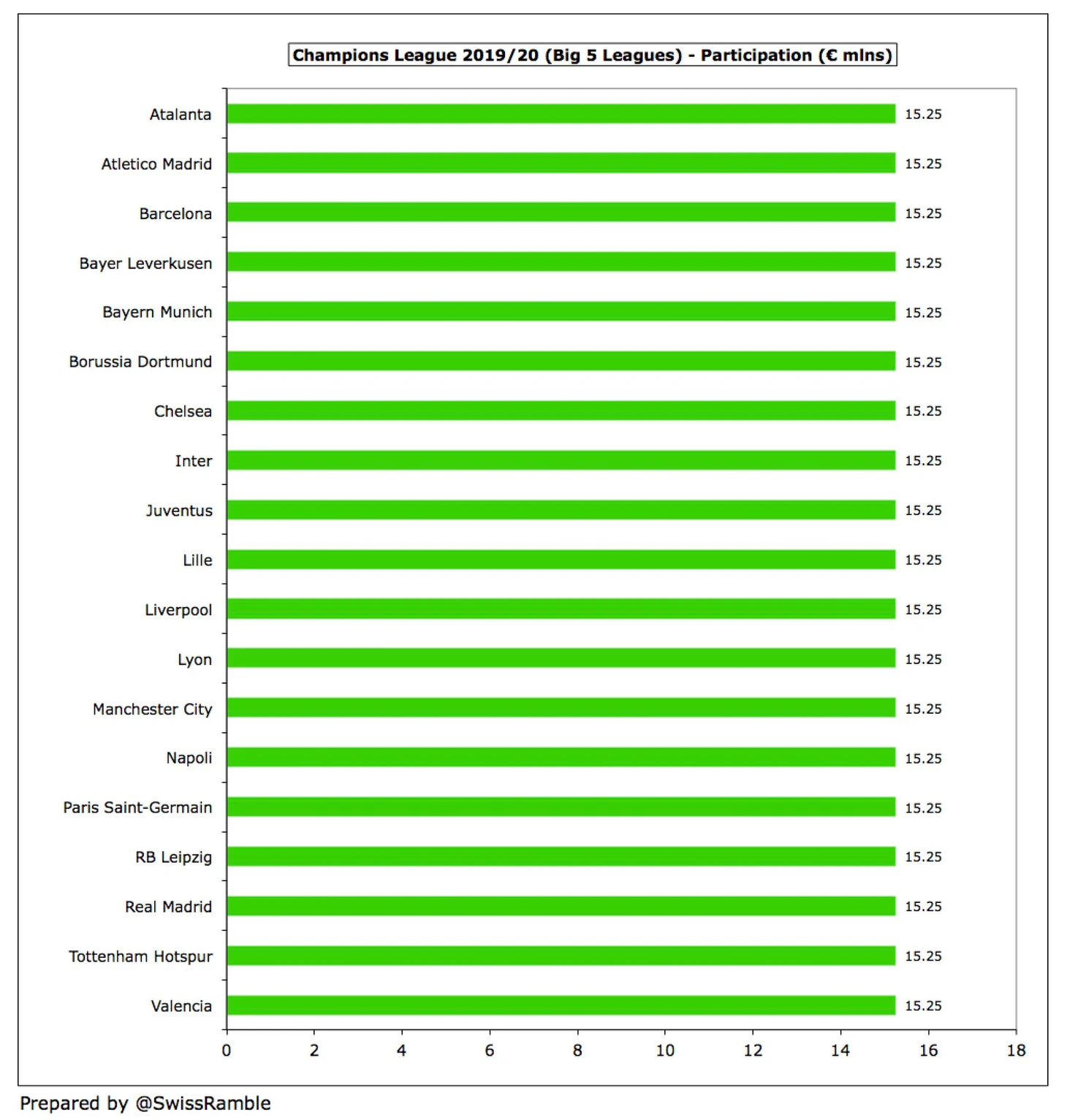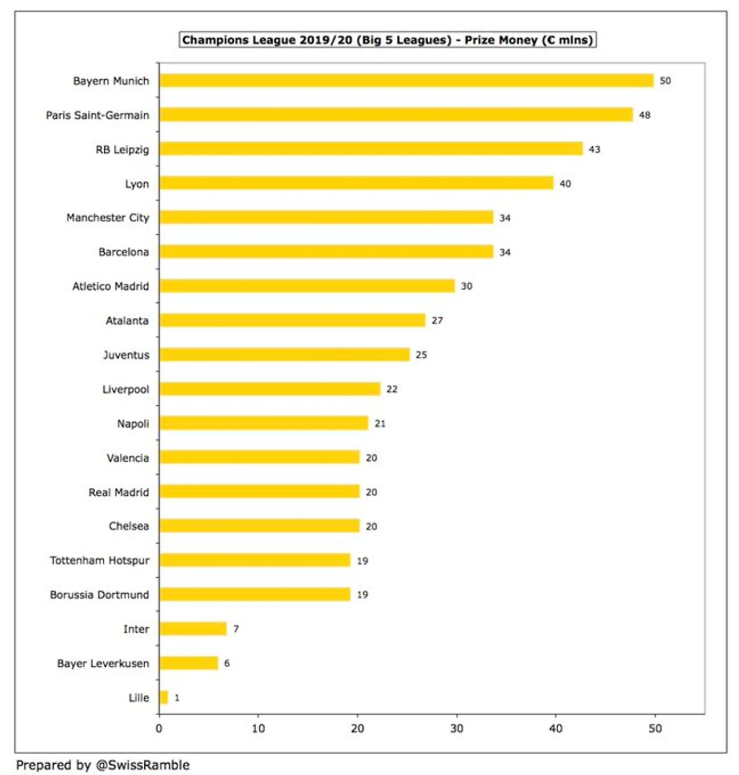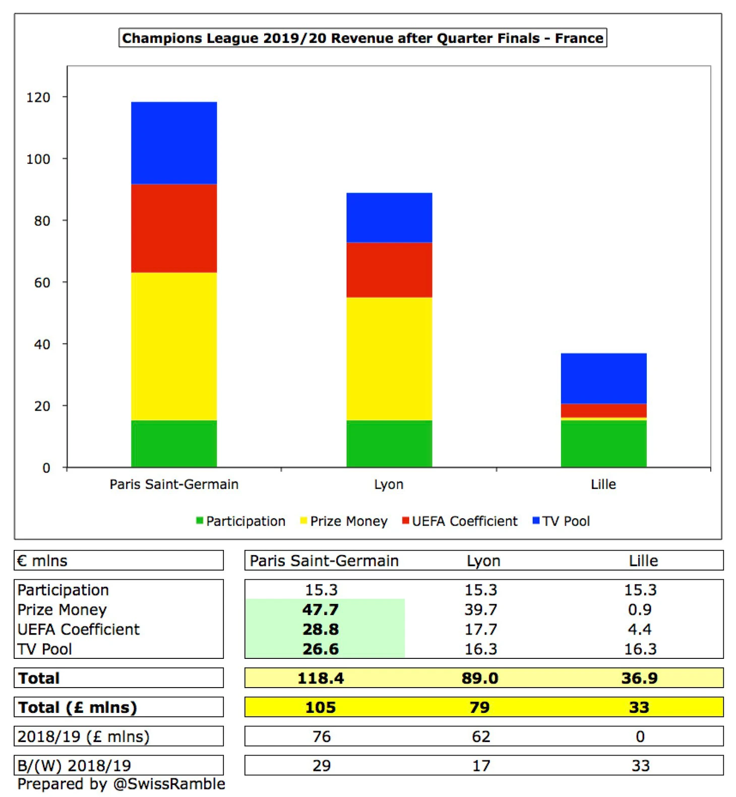 Только три клуба после ¼ сумели заработать более 100 миллионов евро: «ПСЖ» поднял уже 118 миллионов, «Бавария» – 111 млн., «Барселона» – 104 млн. За ними следуют «Манчестер Сити» (99 миллионов), «Атлетико» (95 млн.), «Лион» (89 млн.), «Ювентус» (87 млн.), «Реал» (84 млн.), «Челси» (81 млн.) и «Ливерпуль» (80 млн.).